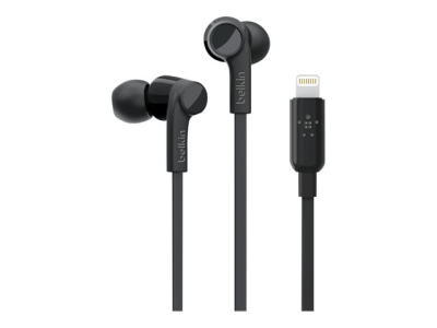 Belkin ROCKSTAR - Hörlurar med mikrofon - inuti örat - kabelansluten - Lightning - ljudisolerande - svart - för Apple 10.5-inch iPad Pro; iPad mini 4; iPhone 7, 7 Plus, 8, 8 Plus, X, XR, XS, XS Max