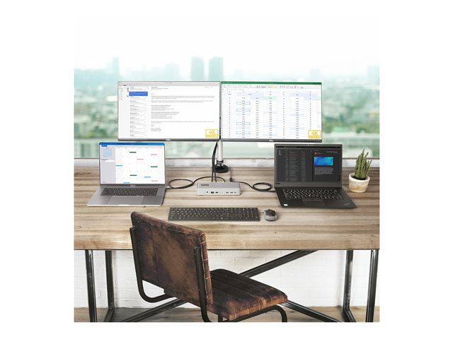 Docka och växla mellan två bärbara datorer för att få tillgång till kringutrustning för arbetsstationer, inklusive dubbla bildskärmar, genom att sömlöst växla från en bärbar dator till en annan med en knapptryckning. Med nedladdningsbar Hot-Key-programvara (tillgänglig för Windows och macOS) kan användare växla mellan datorer med hjälp av tangenter på tangentbordet. KVM-dockningsstationen är idealisk för hemarbete där användarna kan komma åt sina arbets- och hemdatorer från samma arbetsstation.
