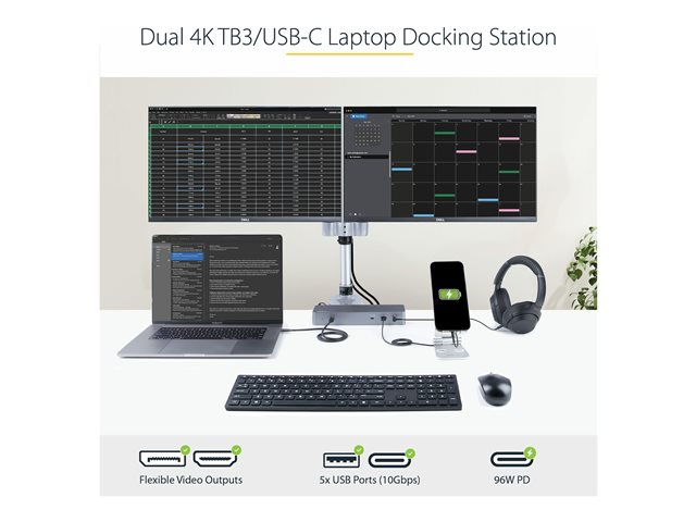 StarTech.com Thunderbolt 3-dockningsstation med USB-C värdkompabilitet - Dubbla 4K 60Hz DisplayPort 1.4- eller dubbla HDMI-skärmar - Singel 8K - TB3/USB-C dockningsstation för bärbar dator - 96 W PD, 5xUSB - 10 Gbit/s - dockningsstation - USB-C 3.2 Gen 2 / Thunderbolt 3 - 2 x HDMI, 2 x DP - 1GbE