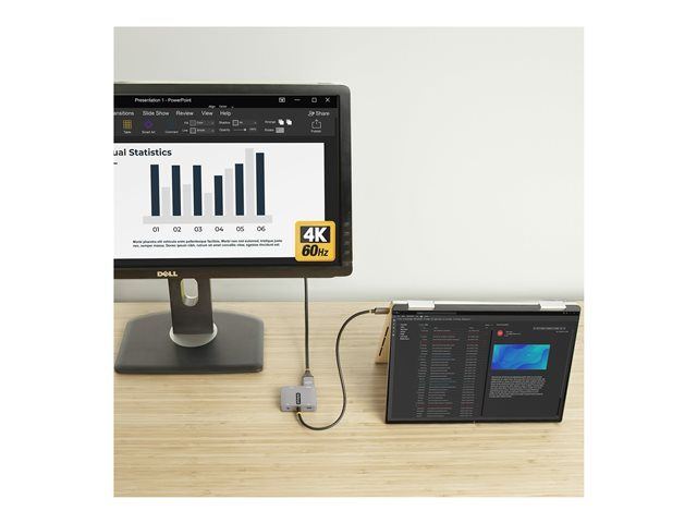 Denna USB-C-videoadapter med flera portar erbjuder en bärbar lösning för anslutning av USB Type-C-enheter till HDMI- och/eller VGA-skärmar, med upp till 100 W strömförsörjning.