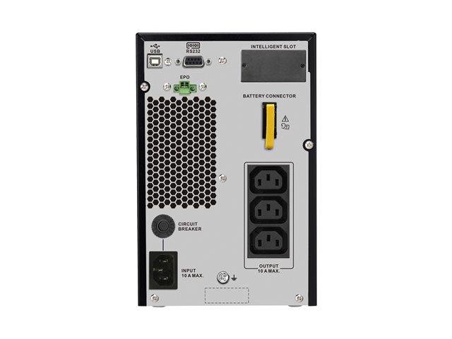| Egenskaper | Vertikal orientering, Hörbart larm, nödavstängning, LCD-bildskärm, intern förbikoppling, Eco-Mode, generatorkompatibel, intelligent batterihantering, dubbel konvertering, larm vid lågt batteri, överbelastningslarm |