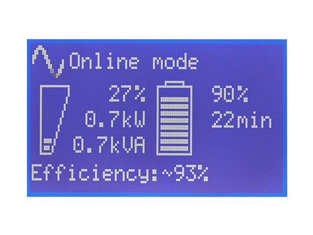 | Egenskaper | Advance Battery Management (ABM), LCD-bildskärm, LED-indikatorer, kallstartfunktion, automatiskt självtest, Remote Emergency Power Off (REPO) |
